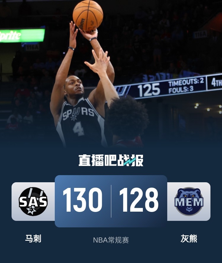 比赛开始,JJJ里突外投连砍7分带队打出不错开局,瓦塞尔中投手感火热单节上双回应,双方比分交替领先,各自替补都有发挥,首节马刺领先1分,次节尚帕尼连中三分,马刺上来轰出17-2攻击波拉开比分,随后双方展开对攻,马刺半场全部上场球员皆得分领先到19分。下半场,JJJ连砍7分助队追分,福克斯连续突破止血,双方展开拉锯战,JJJ继续突破加造杀伤单节轰18分,灰熊三节追到只差3分,末节马刺发力打出7-0再次领先到双位数,肯纳德吃到第2T被驱逐,JJJ接连三分但马刺总能回应,随后JJJ接连勾手扳平,埃迪对福克斯三分犯规,JJJ三分再扳平,福克斯中投绝杀,最终马刺130-128险胜灰熊,终止4连败。