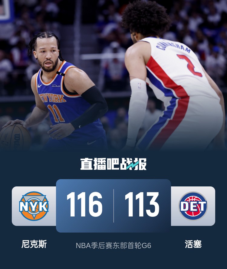 比赛上来,尼克斯就反客为主先拿四分取得领先,活塞此后虽有追分势头,但首节中段又被尼克斯打出一波11-0的小高潮将分差拉开到两位数,布伦森单节轰下15分,次节场上局势发生翻转,比斯利找到外线手感单节命中五记三分球,尤其是半场前的压哨远投帮助活塞成功完成反超,半场结束时尼克斯反而落后2分;下半场回来,尼克斯先拿六分稳住局势,而活塞不到四分钟就已经犯满更是埋下隐患,分差再次拉开到十分以上,末节活塞重整旗鼓并成功利用一波13-0的攻势完成反超,比赛悬念保持到了最后,关键时刻布里奇斯补篮追平,活塞不暂停由康宁汉姆直接上篮没能打进,布伦森急停回拉晃开奥萨尔命中准绝杀三分,比斯利失误葬送机会,最终尼克斯客场险胜活塞,大比分4-2淘汰对手进入东部半决赛。