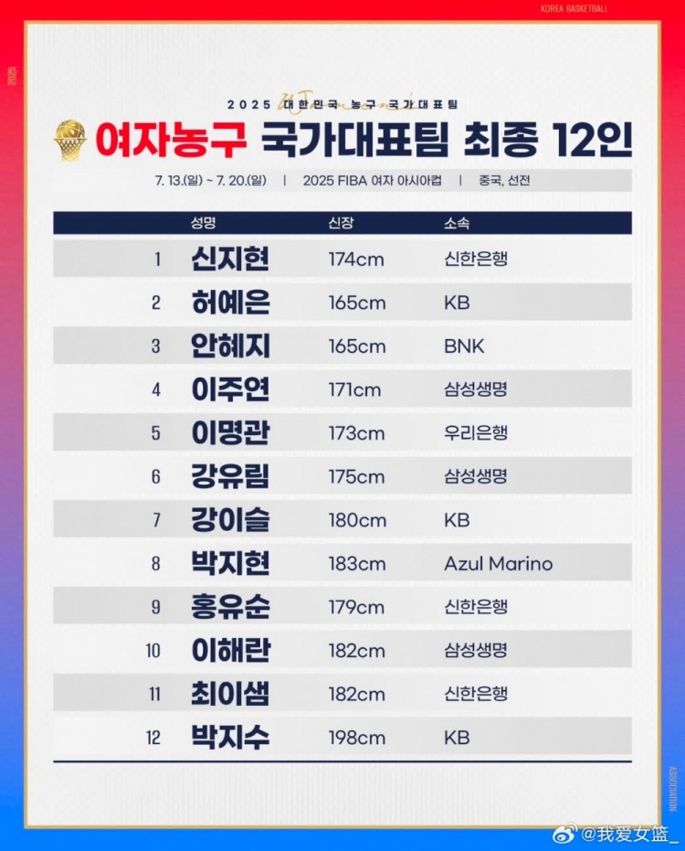 【韩国篮协公布韩国女篮12人名单,朴智秀、朴智贤领衔,金丹妃缺席】昨日,韩国篮协公布了2025女篮亚洲杯韩国女篮12人名单,除35岁的传奇球星金丹妃(图2)以外,朴智贤、朴智秀、姜怡瑟、李海兰等名将悉数在列。她们将在小组赛阶段与中国女篮交手。