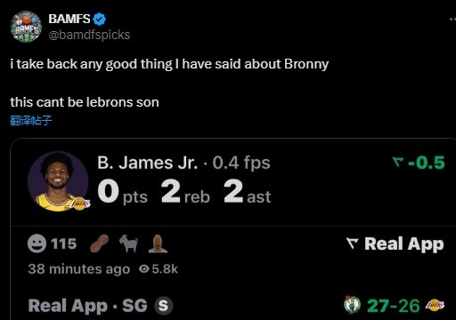 因为上半场布朗尼一分没得,该美媒在中场休息时发文写道:“我收回对布朗尼说过的所有好话,打出这数据不可能是勒布朗的儿子。”