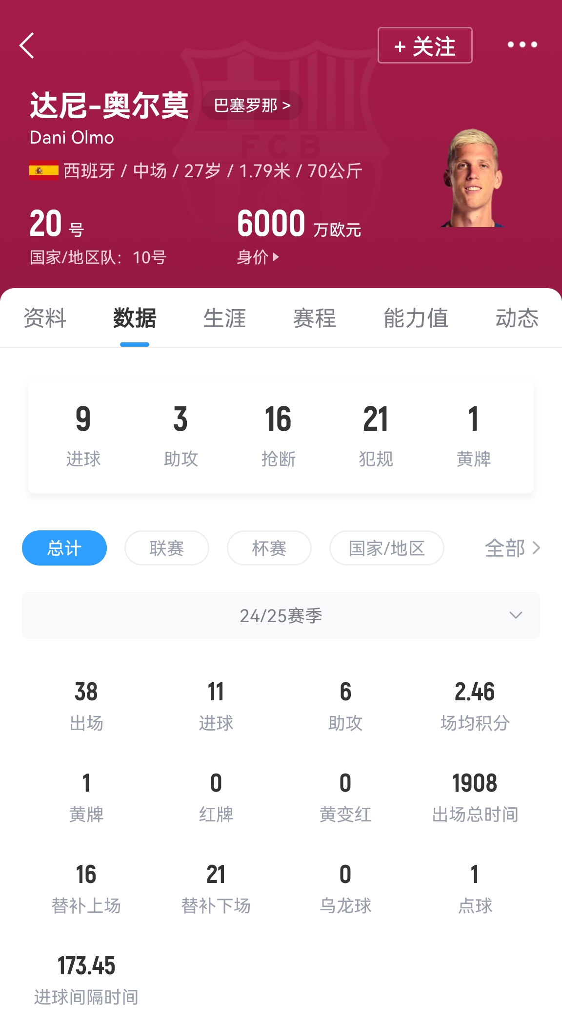 奥尔莫去年夏天5500万欧元加盟巴萨,但一度面临着无法注册的窘境。本赛季奥尔莫出场38次打入11球7助攻,随球队夺得了国内三冠王。