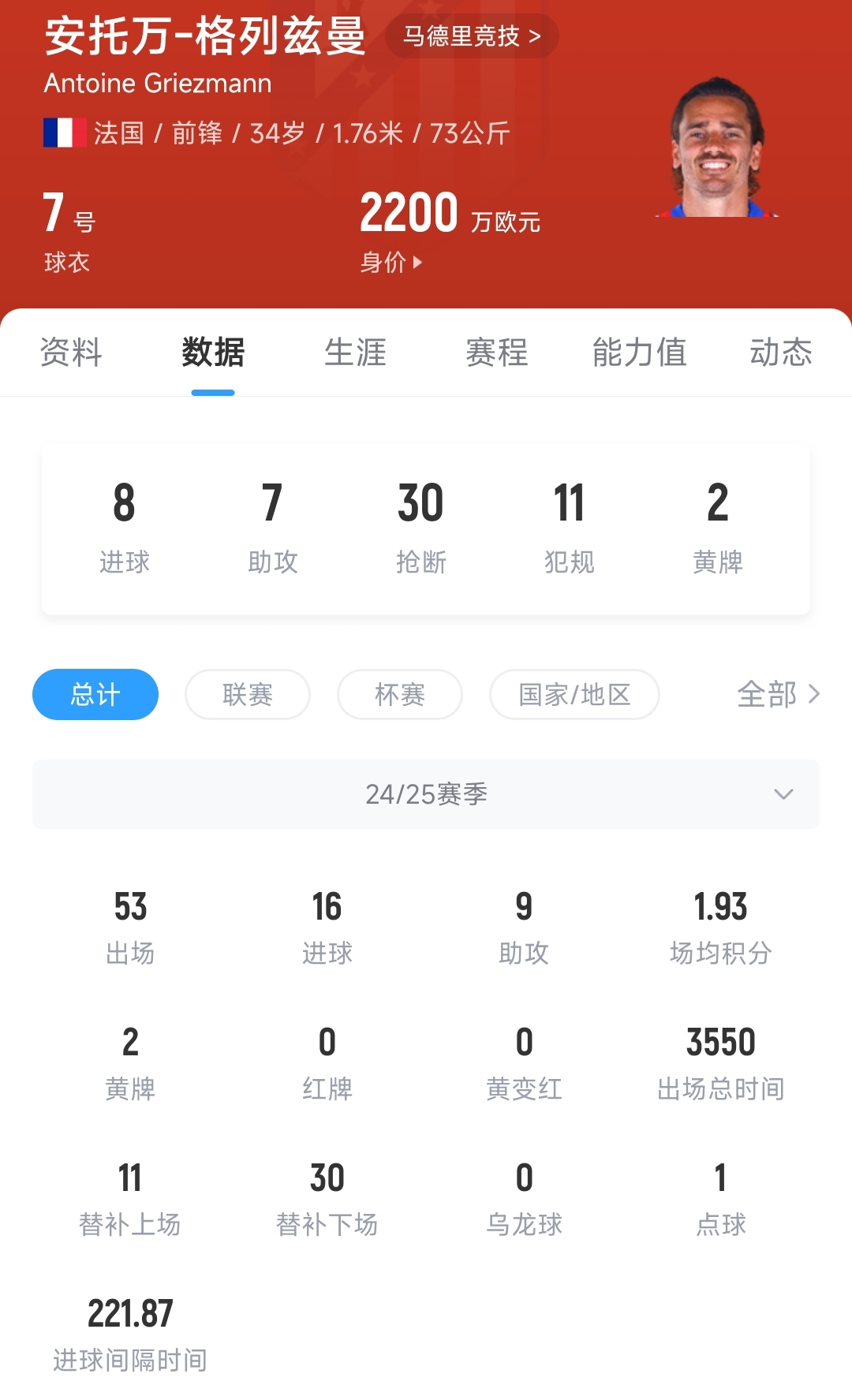 34岁的格列兹曼共为马竞出战442场比赛,贡献197球93助,目前球员德转身价2200万欧。