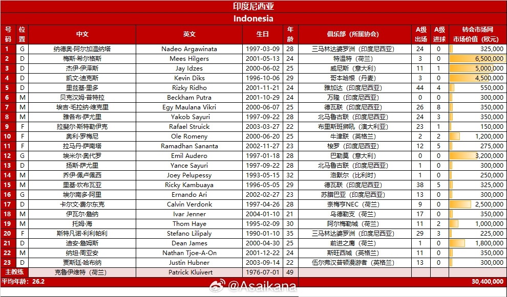 印尼替补:1-阿尔加温纳塔、16-埃尔南多-阿里、2-梅斯-希尔格斯(归化)、4-凯文-迪克斯(归化)、13-扬斯-萨尤里、21-迪安-詹姆斯(归化)、6-贝克汉姆-普特拉、18-伊瓦尔-詹纳(归化)、22-纳坦-周亚安(归化)、9-斯特勒伊克(归化)、11-拉马丹-萨南塔、20-斯特凡诺-利利帕利