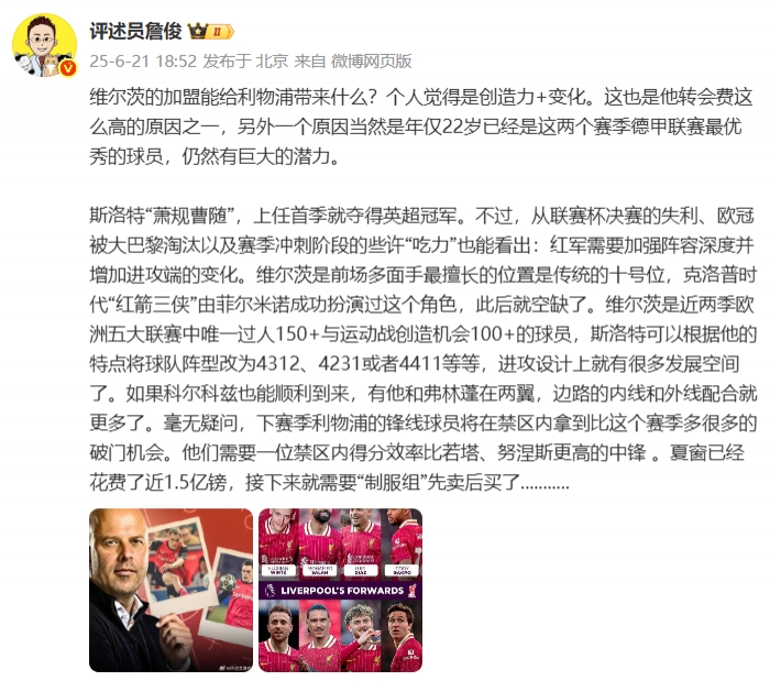 06月21日讯 维尔茨正式加盟利物浦,著名解说员詹俊在社媒分析,谈到了维尔茨的加盟给利物浦所带来的优势。